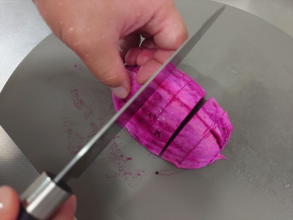 っていうか、赤すぎて見た目がさらに悪い!赤は赤で、なかなかグロテスクな見た目をしており、切ったら赤い汁が・・・。