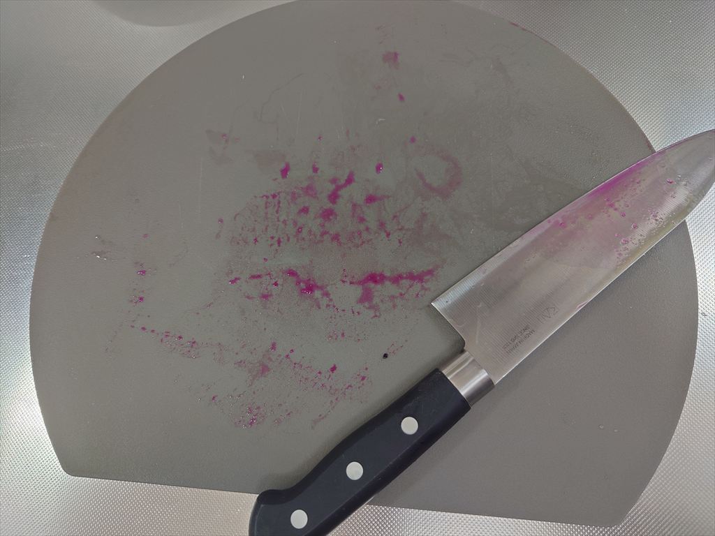 まな板も、速攻で奇麗に洗い流した。このままにして放置してたら、絶対に色がこびりつく。まるで、〇人現場のような絵面である。