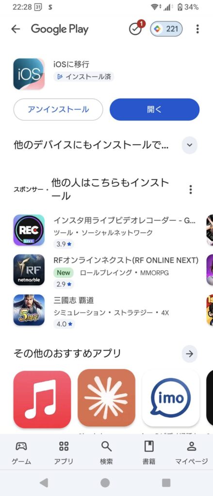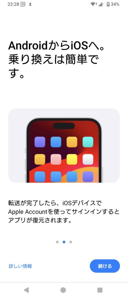 まずは、Android端末で「iOSに移行」というアプリをダウンロードする。