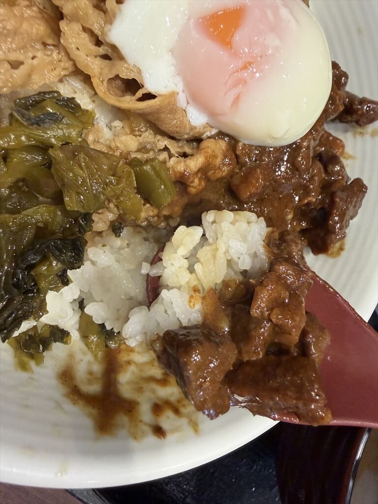 とにもかくにも、味は美味しい。ちゃんと八角を使っていることから、本格的な味となっているし、通常の吉野家の牛も乗っている。