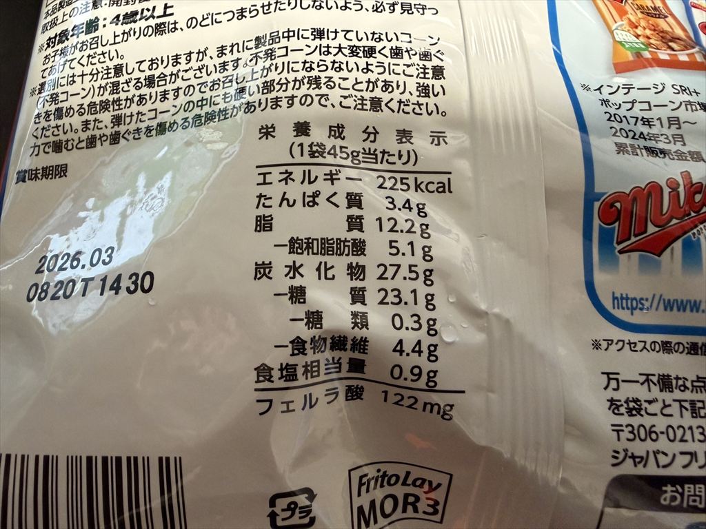 しかし、他のポップコーンと比べ、塩気が多い気がする。食べるほどにお腹が空く感じ。塩味がポップコーンによく合う。