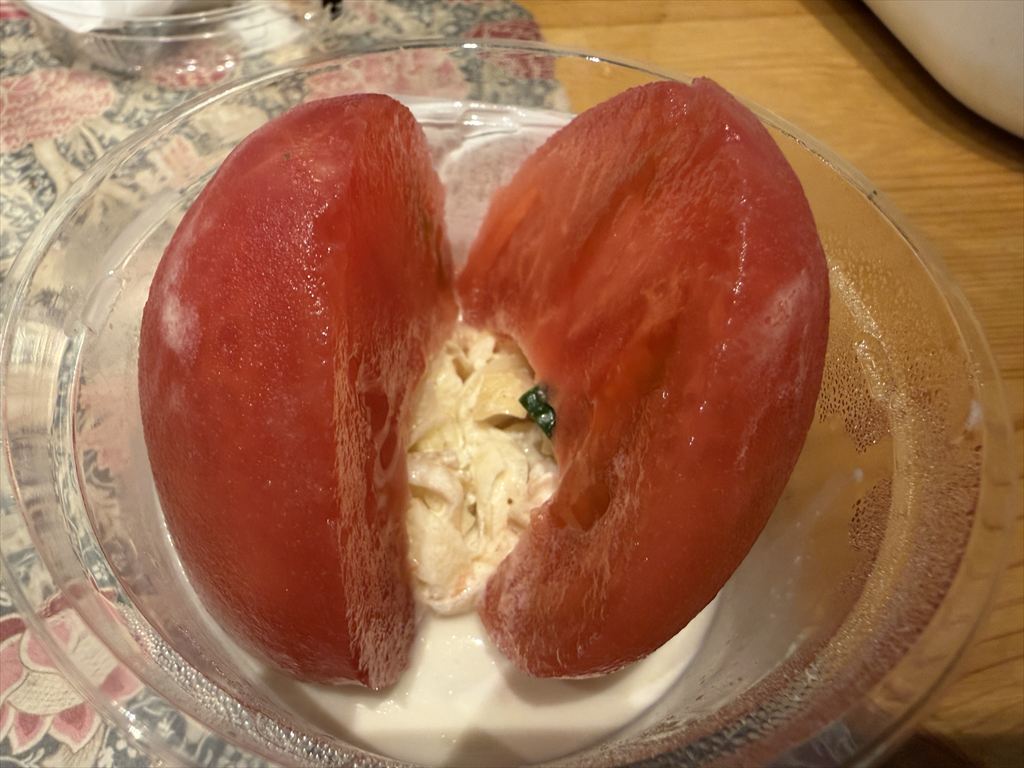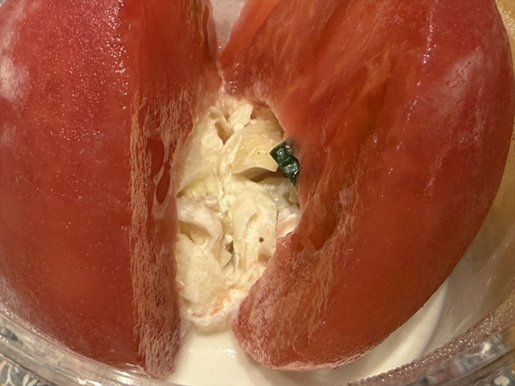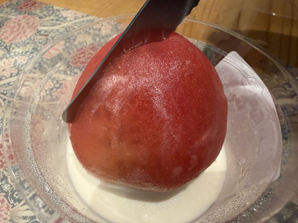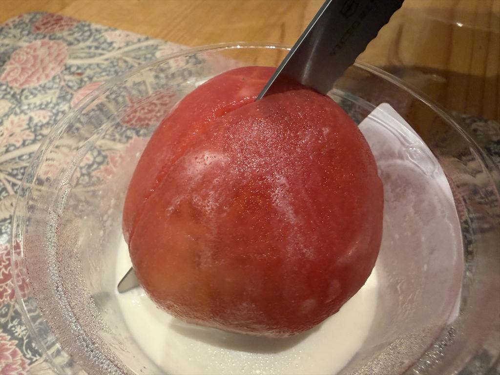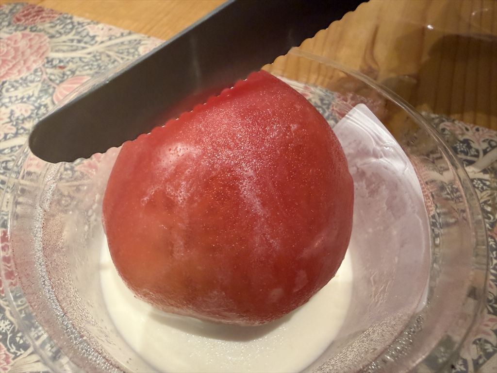 しかもご丁寧に、トマトの皮が奇麗に剝かれているではないか。まるで大きなルビーを見ているようだ。