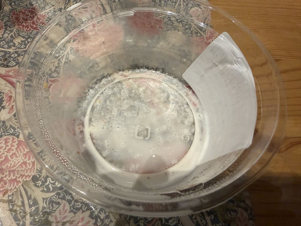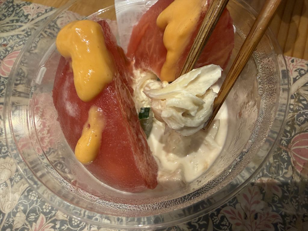 ここで思ったのが、下に溜まっていた白い汁は、おそらくマヨネーズなどで和えた液体だろう。少しマヨネーズの薄まった感じが伝わる。