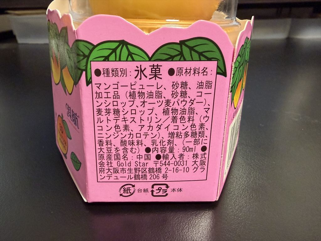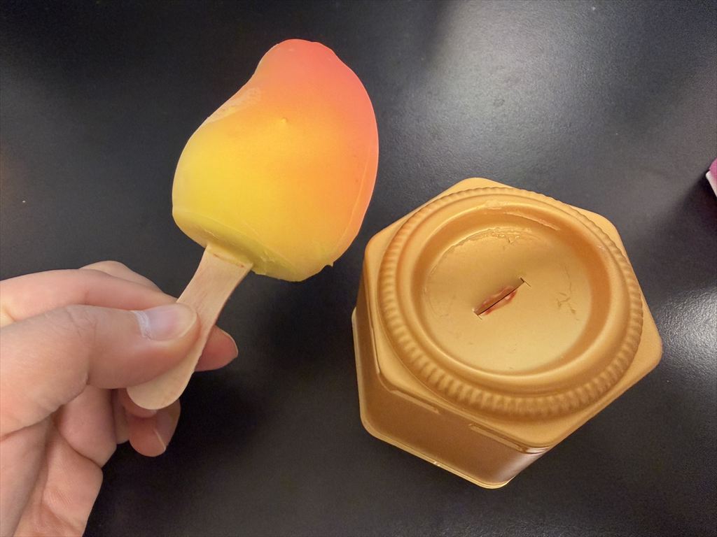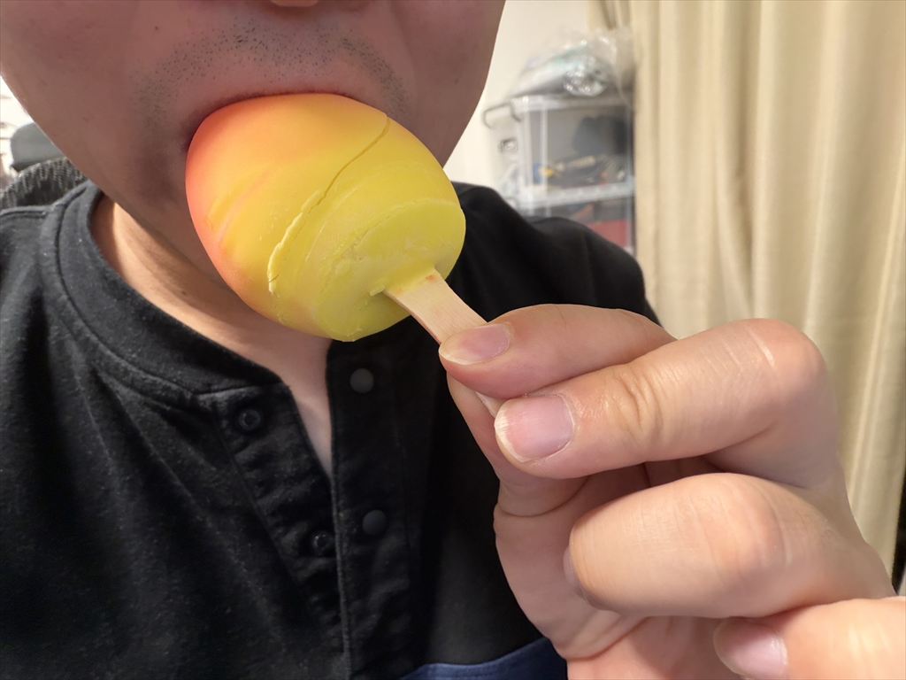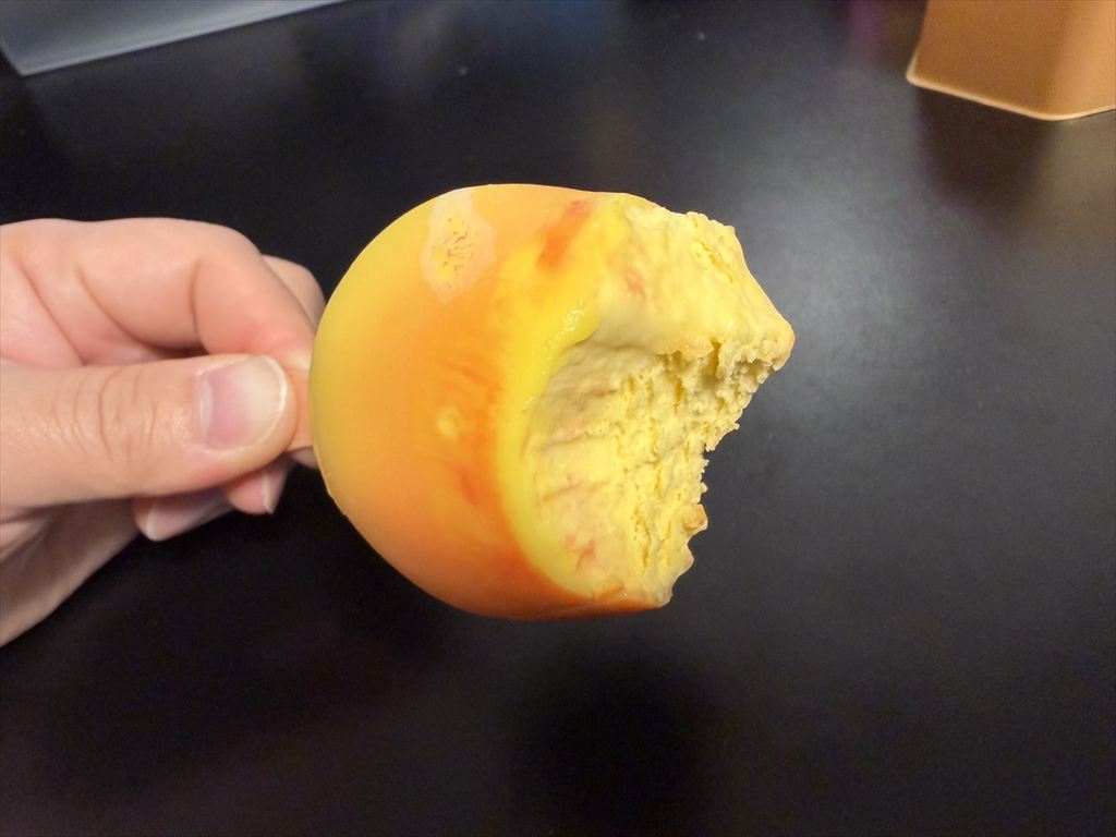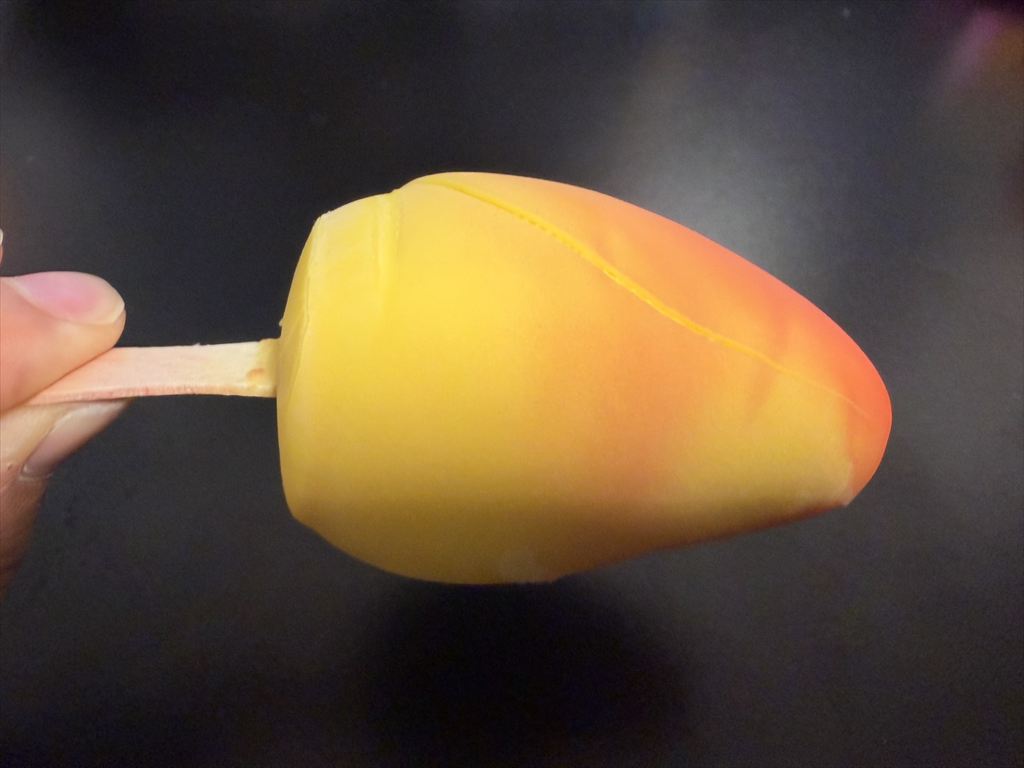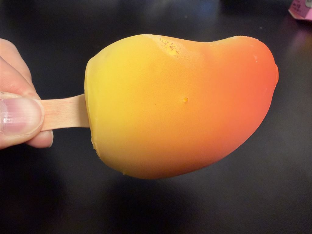 外側はマンゴー味のチョコレート、中身はマンゴー味のソフトクリームとなっている。