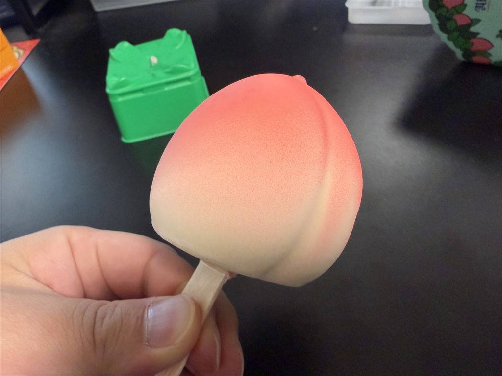 外側はこちらもチョコレートで、中身は桃のソフトクリーム。