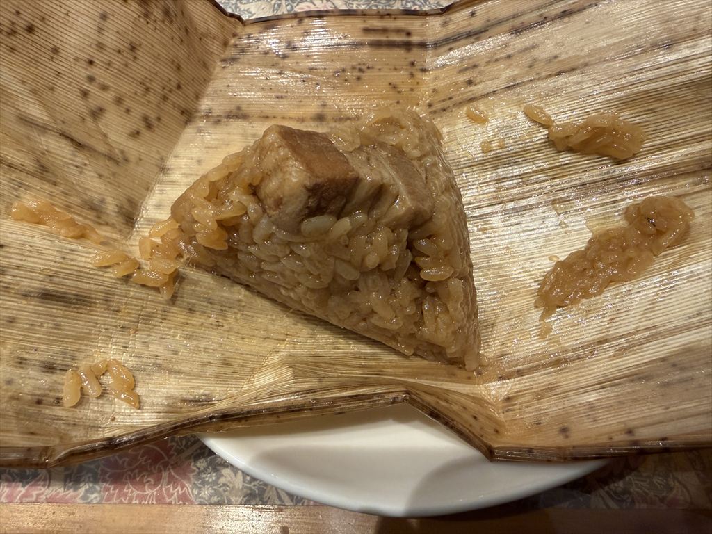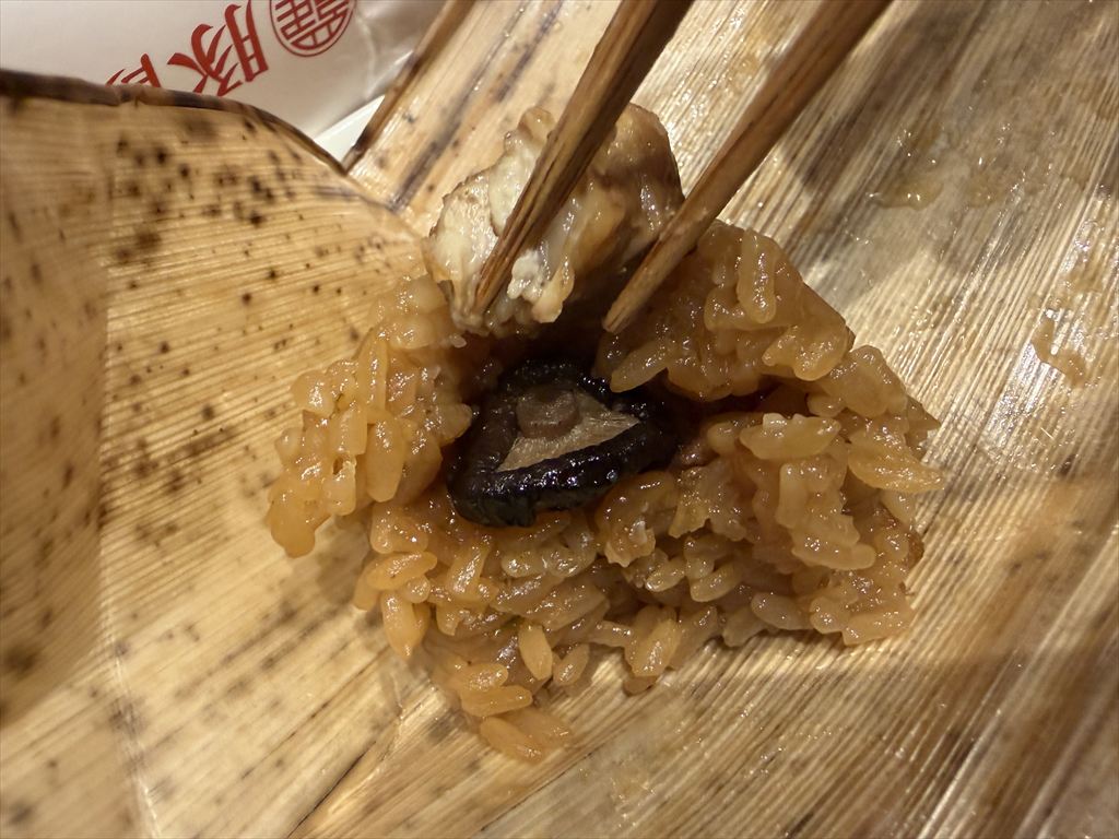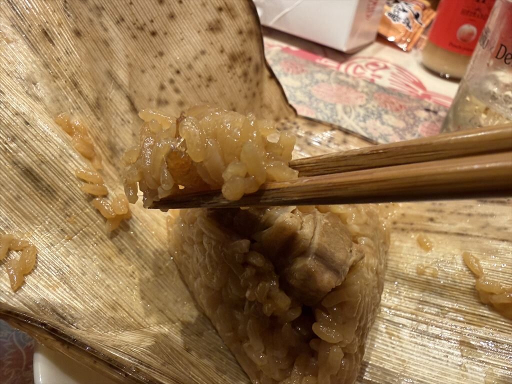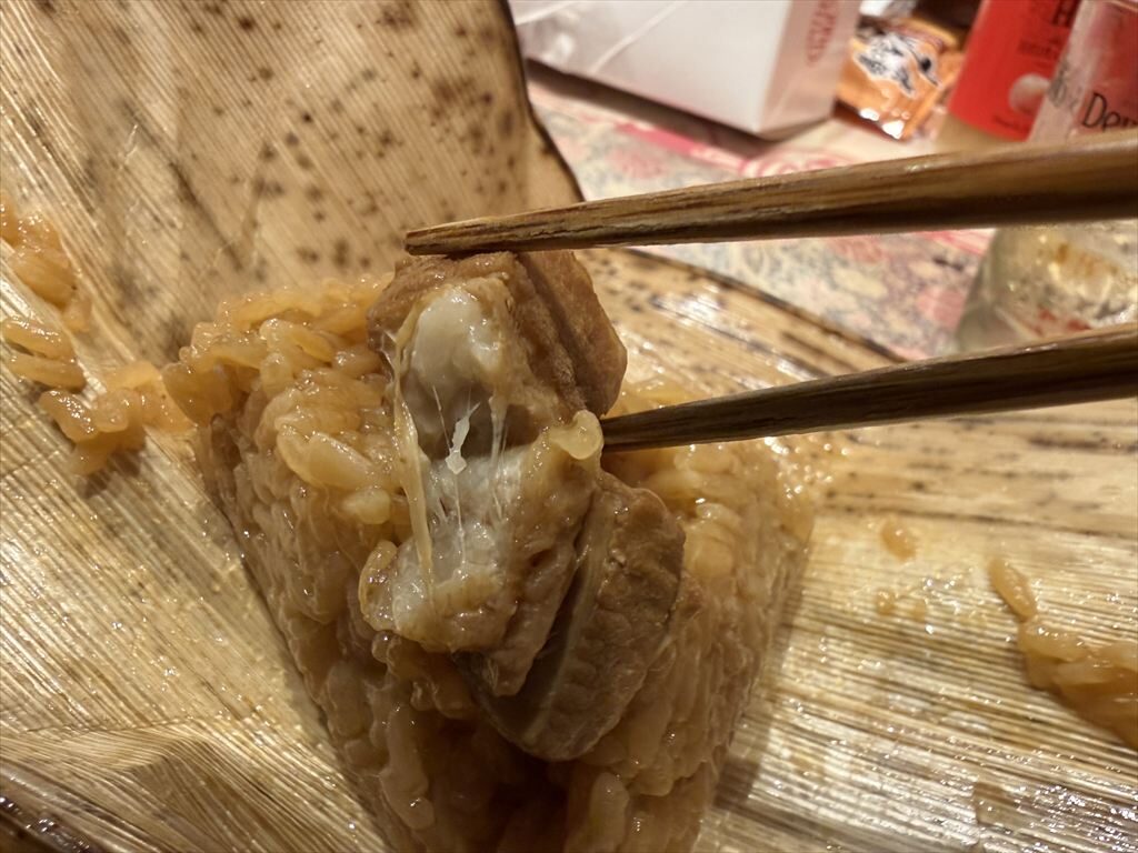 食べてみると、しっかりと出汁の効いたもち米のモチモチ触感と、竹の風味が鼻を抜ける。そこに、チャーシューの脂身が合わさって最高に美味しい。