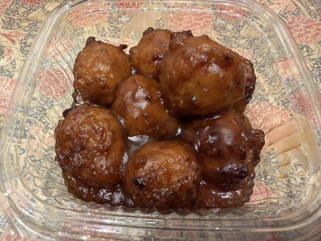 食べてみると、思っていたよりもフワフワしている。そして、肉団子と言われるほどの肉々しい感じはない。ソースはケチャップがメインなのか、トマトの風味が強く、酸味を強く感じる。噛むごとに、ふわふわ団子の中の玉ねぎがシャキッ、シャキッと音を立てる。
